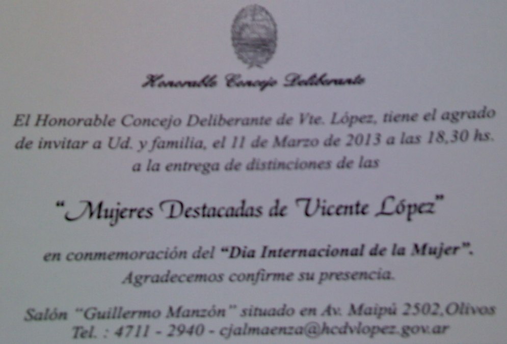 Por todo ello, como es tradición y en el marco de la conmemoración por el Día Internacional, el Honorable Concejo Deliberante de Vicente López reconocerá el lunes 11 de marzo de 2013 a las 18:30 hs en el Salón Manzón (Av. Maipú 2502, Olivos), como "Mujeres Destacadas del Municipio" a un grupo de Mujeres aunando el reconocimiento de la comunidad.